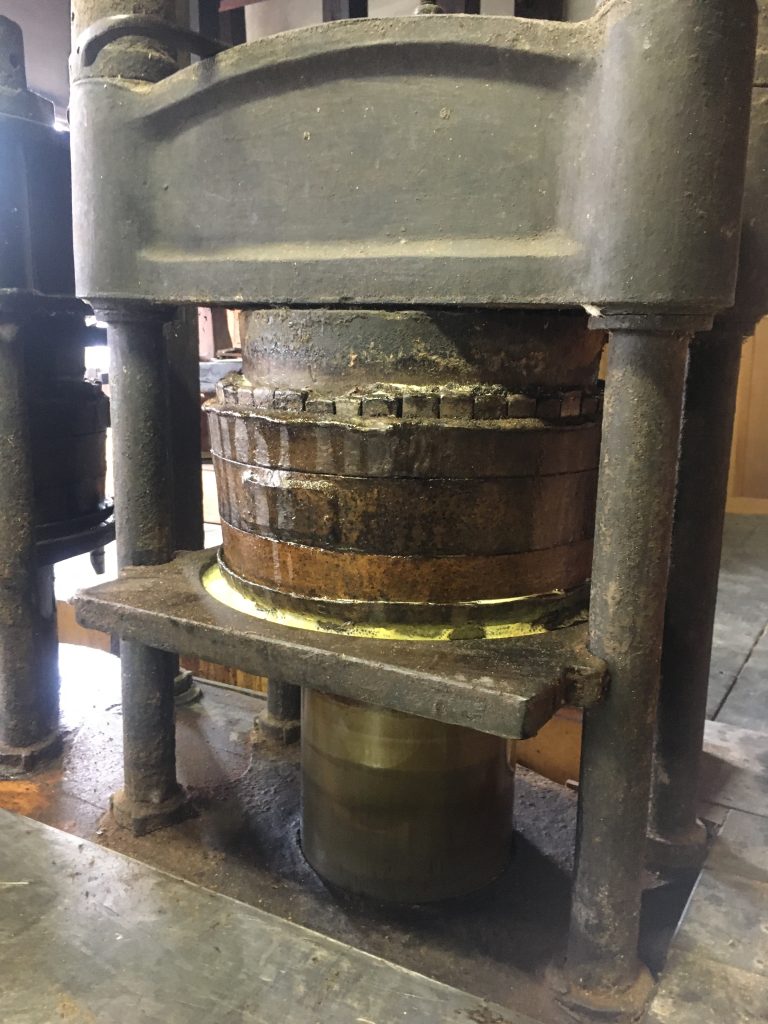 などにわかれ、単に設備を移動したら使えるというものではありません。平出油屋では、大きな1つのモーターで、平ベルトをつけたり、はずしたりして油圧ポンプ、昇降機、焙煎釜、送油ポンプを動かしていましたが、平ベルト自体が製造されていないため、それぞれの機械にモーターをつけることになりました。玉締め機を動かす油圧ユニットは老朽化のため、新しいものに交換します。
