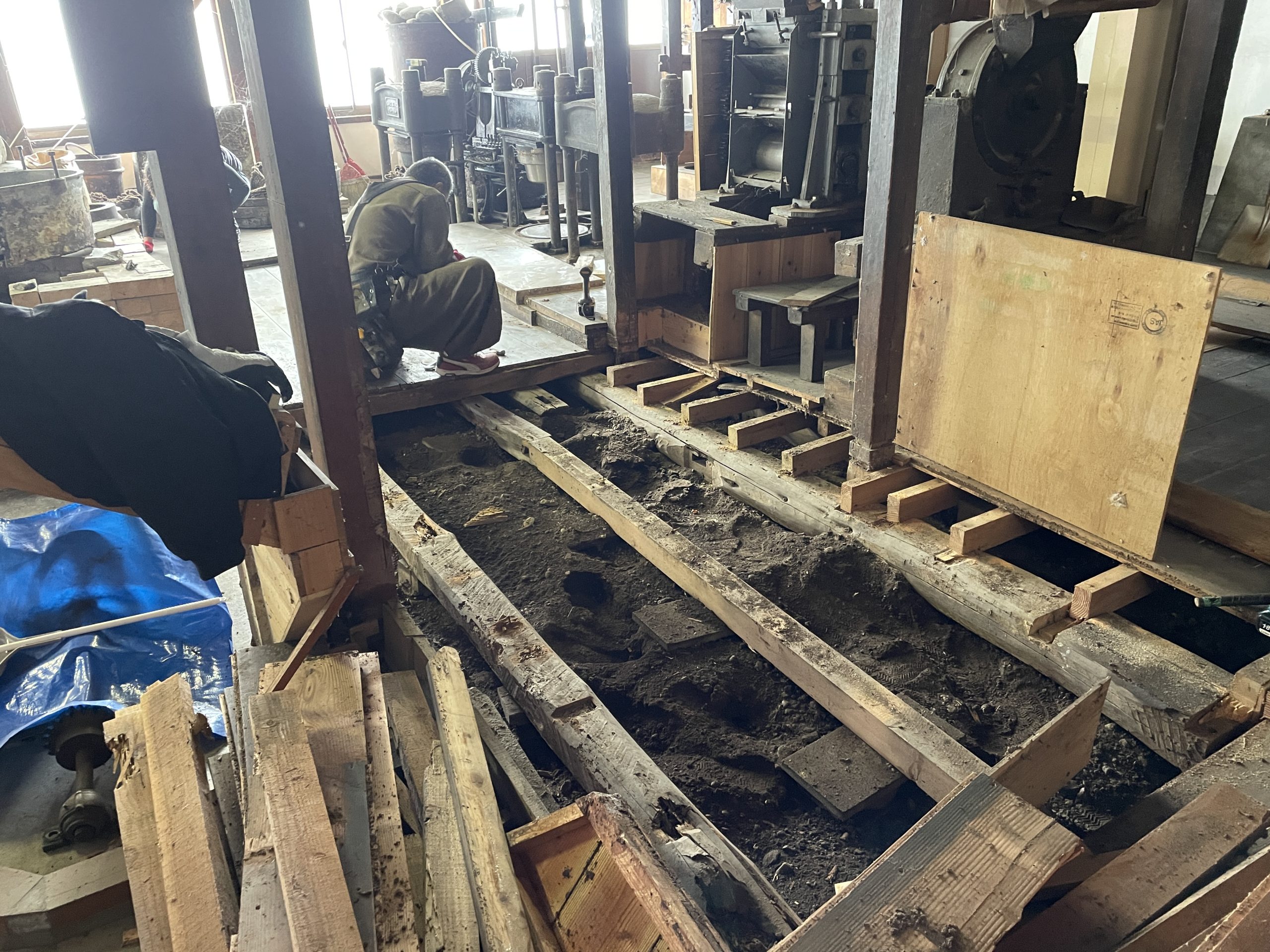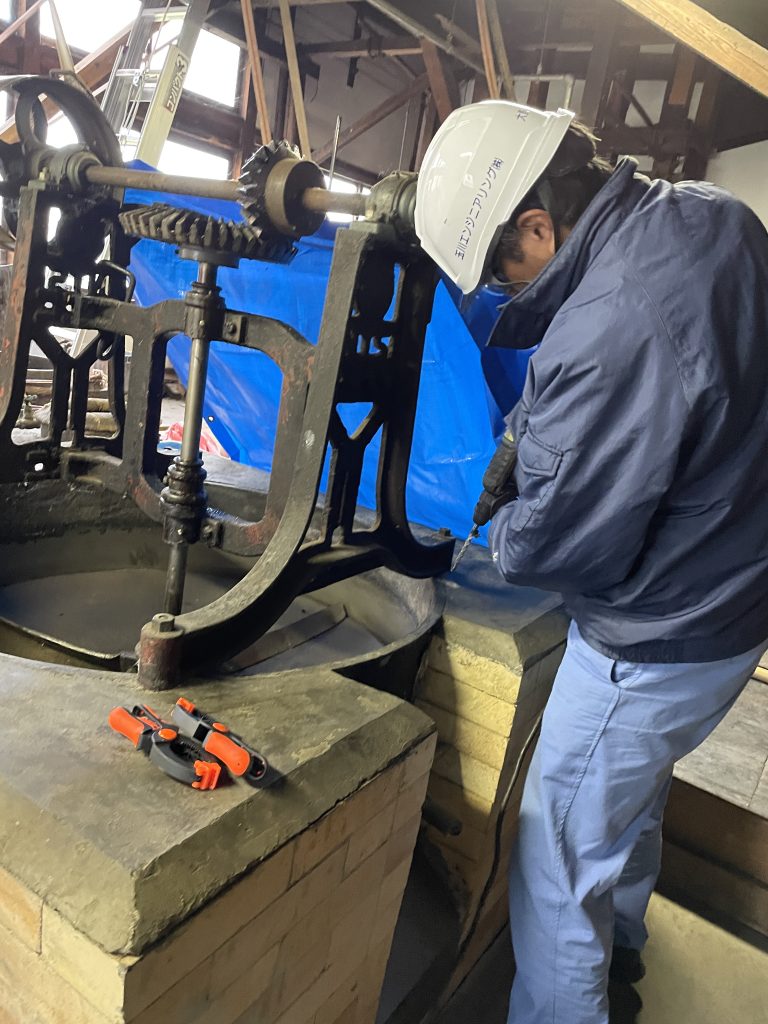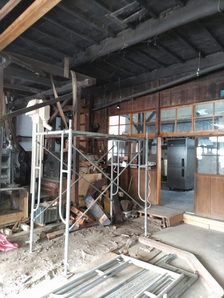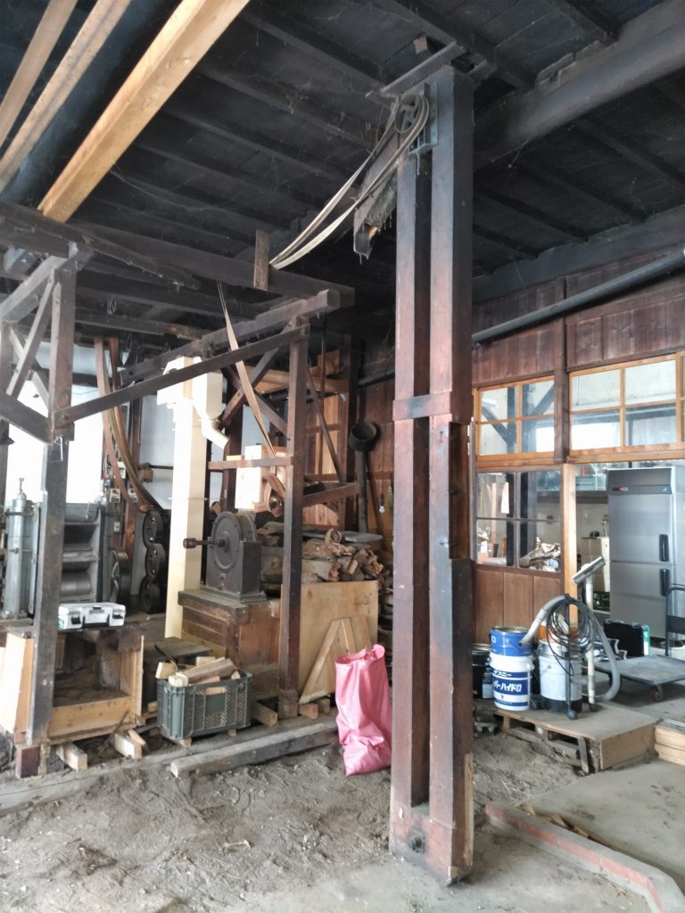 結局、食品加工(搾油)関係はすべて蔵内に収め、下屋は、食品ではない油粕の粉砕などになりました。そのため蔵内のみ天井、耐水性の壁(石膏ボード)を張り、食品衛生法上の対応を取ることにしました。