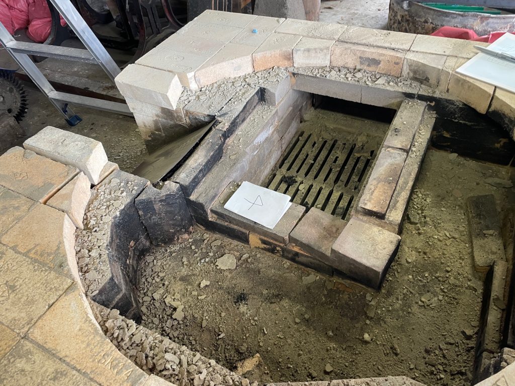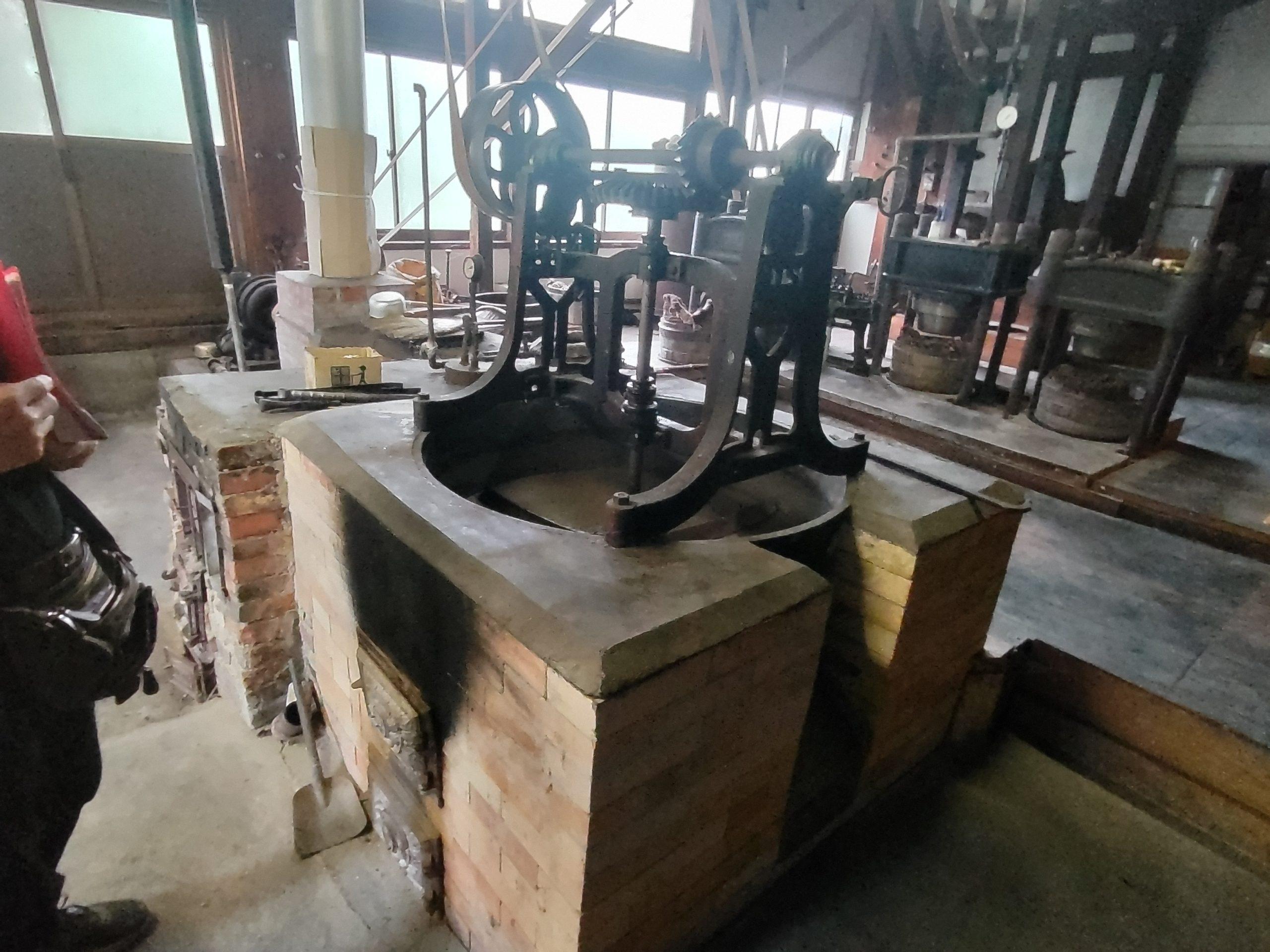 搾油施設は、蔵(上記図面左側)とそれに付随する下屋(右側)からなりますが、2回目のときの配置図では、下屋に焙煎器を配置していました。平出さんが、薪で焚く焙煎釜は夏は暑くなるので、別室の方においた方がよい、とアドバイスしてくれたためです。しかし、下屋の屋根は低いために煙突をどのように設置するかという問題が出て、蔵の内部(上記図面①焙煎器)に変更することになりました。