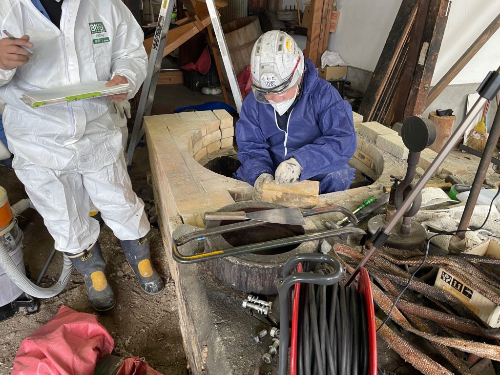 また、蒸気ボイラーは、薪で焚く方式や廃食油を利用したものなどを検討しましたが、非常に高価になることがわかり、結局、電気ボイラーを採用することになりました。この古民家では、すでに会津電力(株)の再生可能エネルギー由来の電気が来ており、引き続きそれを利用します。コンパクトなので、これも蔵内に置くことにしました。上記図面では、④蒸しのところになります。